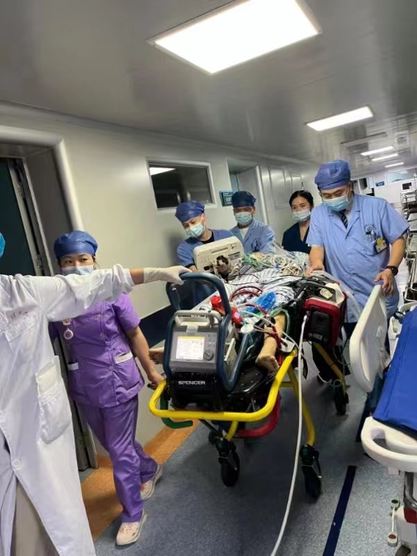 永州市三医院重症医学科主任秦剑军综合分析病情后,迅速排除其他诊断,决定求助上级医院进行ECMO治疗。在请示医务科后,立即联系湘雅医院重症医学科马新华教授团队并简单汇报了病情,马新华教授认可了市三医院的诊断,在30分钟内准备好全套ECMO装备及五人团队,立即出发前往永州市第三人民医院。同时秦剑军带领科室团队,积极做好术前准备,虽然市三医院重症医学科没有ECMO机器,但获ECMO培训合格证的有四人,并且派了两个医护小组赴南方医科大南方医院及珠江医院进行了专项进修。医护团队积极给患者做生命支持与监测,但患者情况越来越差,在17:55马教授团队刚踏入重症医学科门口时,患者心跳停止,意识昏迷,抢救团队马上使用自动心肺复苏机为患者进行胸外按压,并紧急启动ECMO做体外支持心肺复苏术(ECPR),经过30分钟的努力,顺利启动VA-ECMO,患者全身灌注迅速得以改善,意识渐渐恢复,脑氧监测结果也在正常范围内,马新华教授团队立即将患者转运至湘雅医院做进一步治疗。