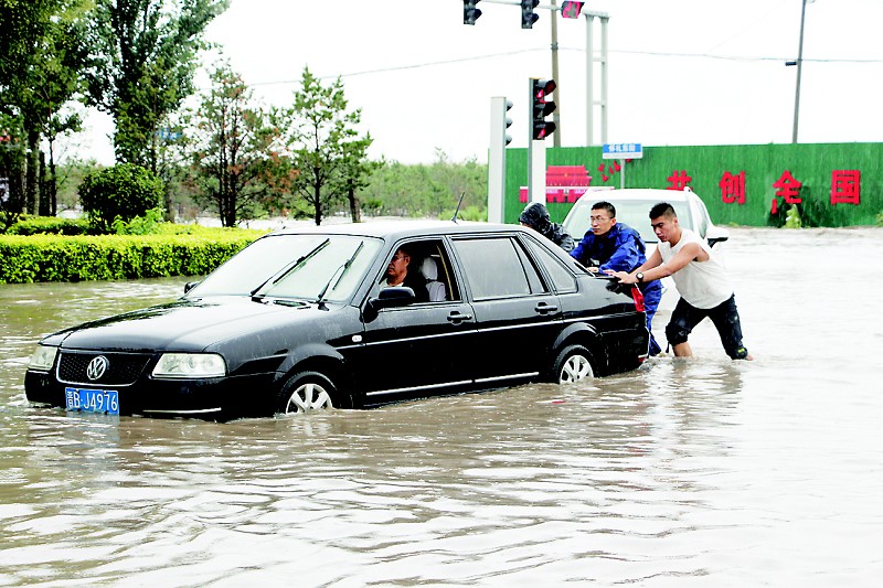 朔州市开发区某路段桥下积水严重,有车辆被困。消防救援人员用救援绳索将被困车辆拉出积水路段。