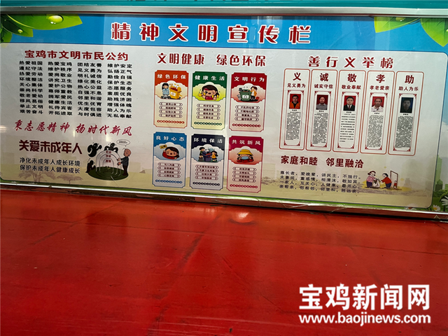 在渭滨区经二路新民路社区里,一块精神文明宣传栏格外醒目,上面一侧印着善行义举榜,社区按照“助人为乐、孝老爱亲、诚实守信、敬业奉献、老有所为”五个类别为好人好事立榜,宣传宝鸡市各县区涌现出的道德模范。