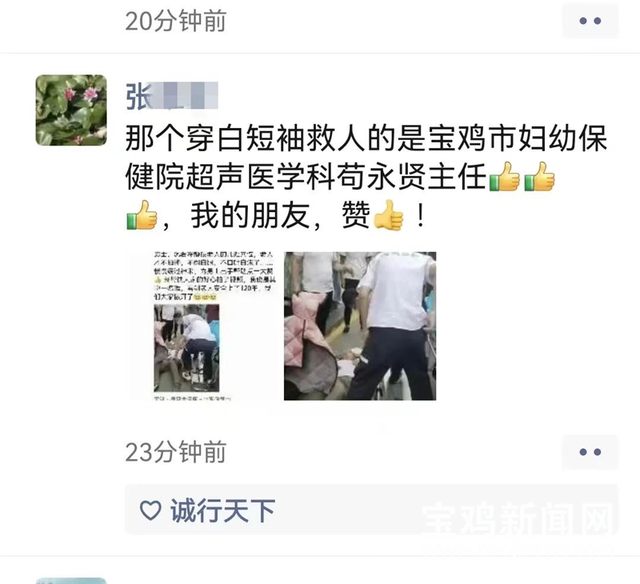 随后,男子救人的视频很快在网络中传开。8月11日,有人认出了这位救人不留名的英雄,他就是宝鸡市妇幼保健院超声医学科副主任苟永贤,大家纷纷为他救死扶伤、默默奉献、做好事不留名的行为点赞。