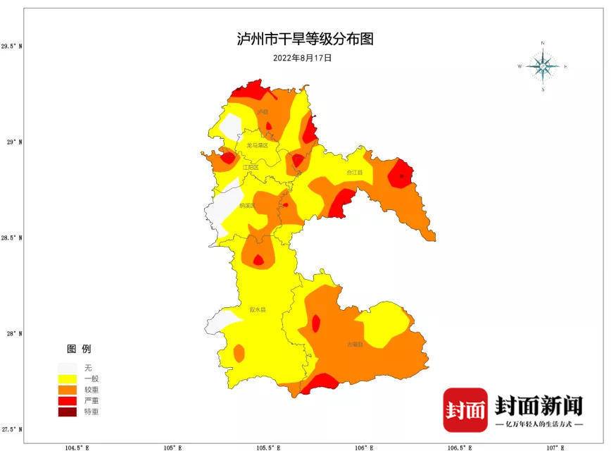 8月7日-17日,泸州市大部分地方发生不同程度干旱,其中泸县北部、东部,合江县东部、南部,纳溪区东部,叙永县北部以及古蔺县中部、南部干旱较为严重。