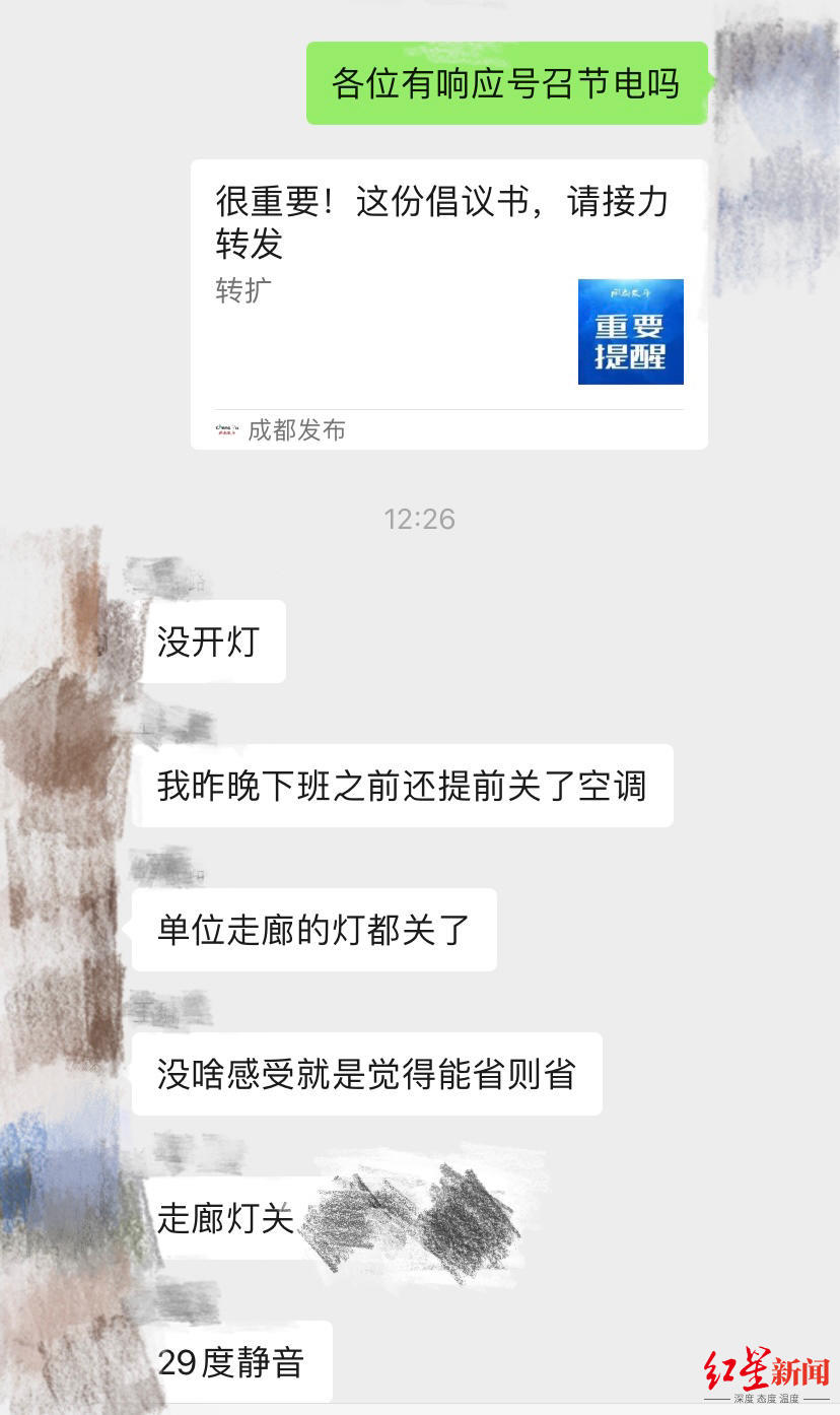 成都市民乔女士在看到这份节约用电倡议书后,就转发到了微信群聊中,并询问大家“各位响应号召节电了吗?”乔女士告诉记者,她是担心有人没注意到这份倡议书,于是提醒一下朋友,“每个人节约一点点电,那么供电压力就少一点。”