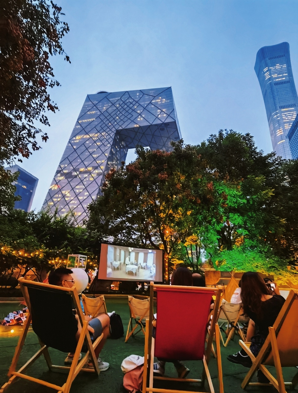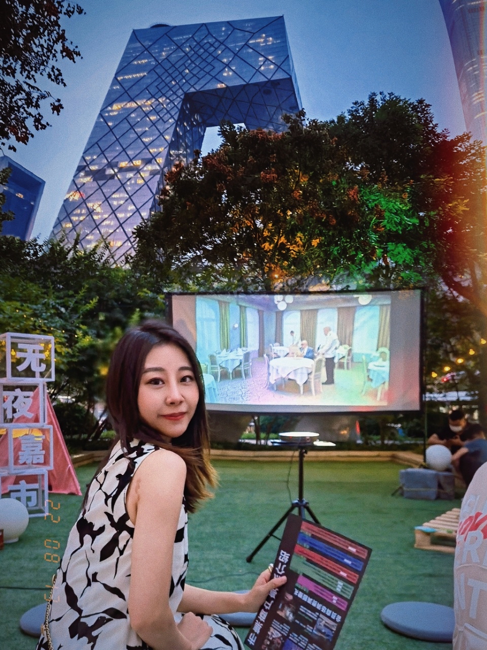 最吸引我的莫过于大裤衩下的露天电影!嘉里的私人花园被布置成露营风格,法式躺椅+户外大荧幕,瞬间找回了度假感。外界的车水马龙全然被隔离在外。