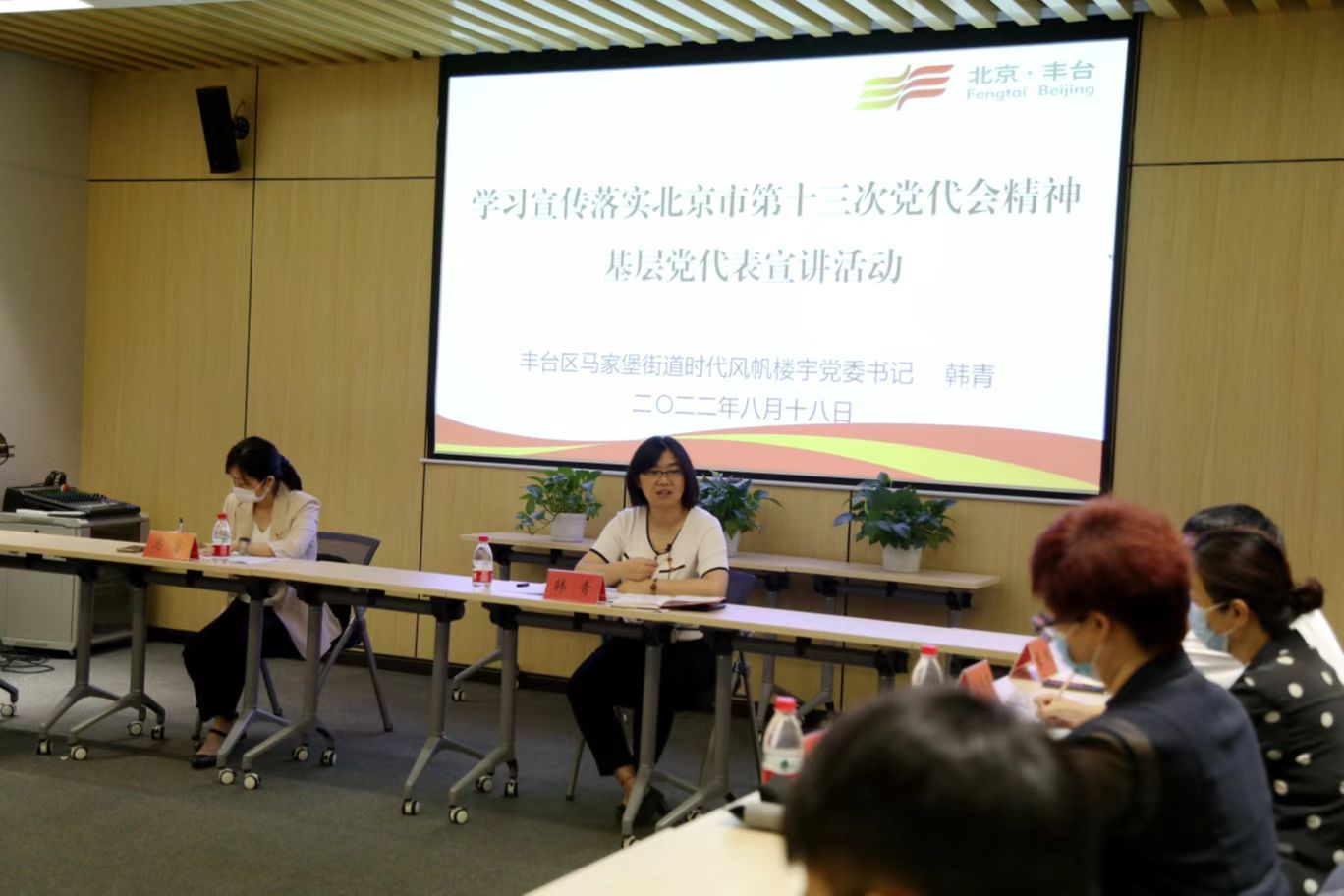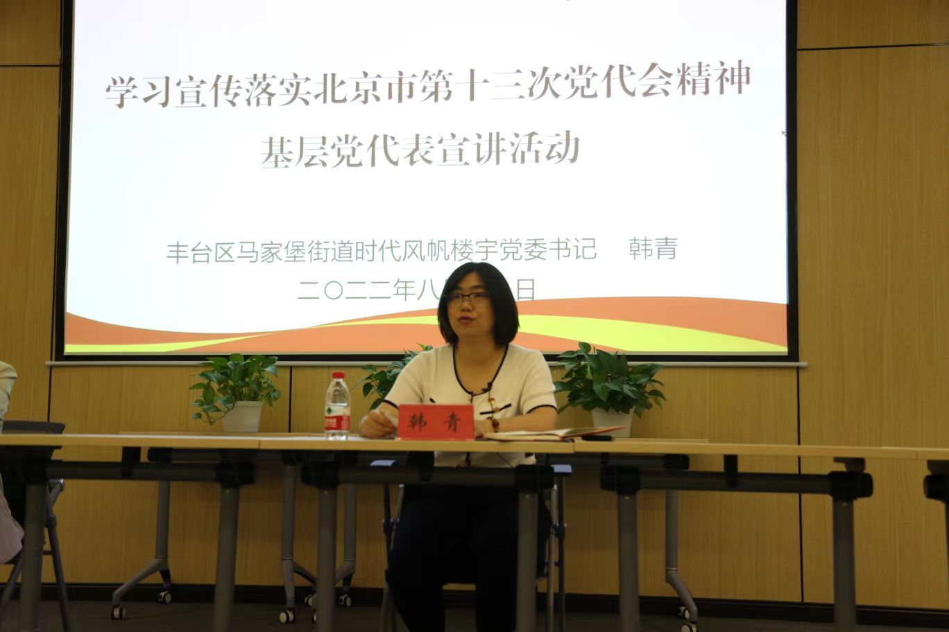 “千头万绪的事说到底就是千家万户的事,为企业办好事,让企业好办事始终是我们服务的宗旨。”8月18日上午,丰台区举办学习宣传落实北京市第十三次党代会精神基层党代表宣讲活动,市第十三次党代会代表、丰台区马家堡街道时代风帆楼宇党委书记韩青在丰台区党群服务中心以《创新楼宇“服务包” 为企服务 为民办事》为题,围绕“新时代首都发展”“结合报告谈楼宇党建”“企业吹哨、部门报到”开展专题宣讲,将市第十三次党代会精神带到“两新”党组织。现场共有20位丰台区“两新”党组织书记聆听了宣讲报告。