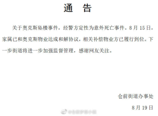 19日,杭州市余杭区仓前街道办事处发布通告:关于奥克斯坠楼事件,经警方定性为意外死亡事件。8月15日,家属已和奥克斯物业达成和解协议,相关补偿物业方已履行到位。下一步街道将进一步加强监督管理。
