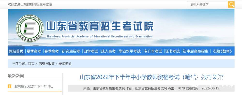 齐鲁网·闪电新闻8月19日讯 闪电新闻记者今天从山东省教育招生考试院官网获悉,山东2022年下半年中小学教师资格考试(笔试)将于10月29日进行,考生可于2022年10月25日至28日登录中国教育考试网打印准考证。