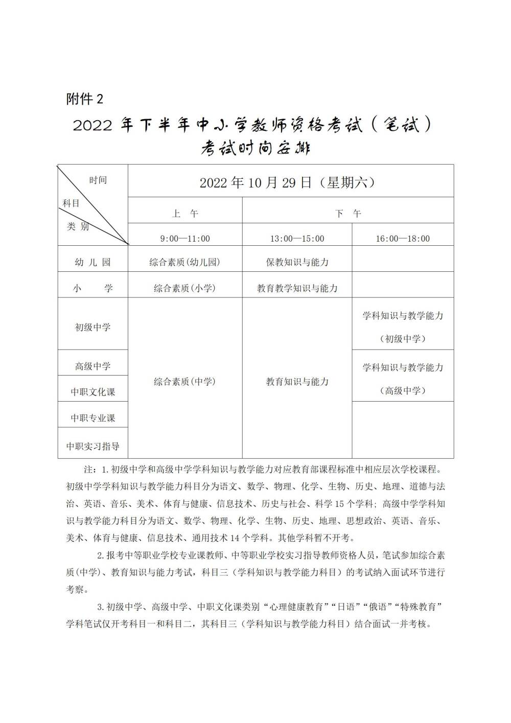 因疫情存在动态变化,疫情防控工作要求也将根据形势进行调整,请考生配合执行属地和最新考试疫情防控工作要求,务必于考前登录山东省教育招生考试院网站查阅《致2022年下半年中小学教师资格考试(笔试)考生的一封信》,了解考试和防疫政策信息,按照相关要求做好防疫检测和考试准备工作。考生请于考前7天起每天如实填写《山东省2022年下半年中小学教师资格考试(笔试)人员健康管理信息采集表》,并于每场考试入场检查时上交考点。