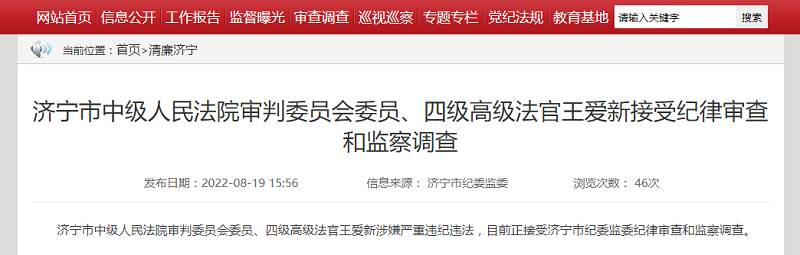 济宁市中级人民法院审判委员会委员、四级高级法官王爱新接受纪律审查和监察调查