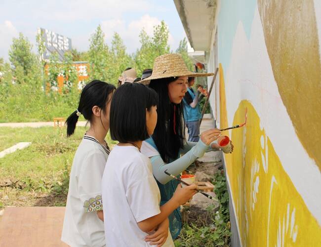 山东师范大学美术学院“蒲公英”乡风文明社会实践队队员带领当地小朋友制作墙绘