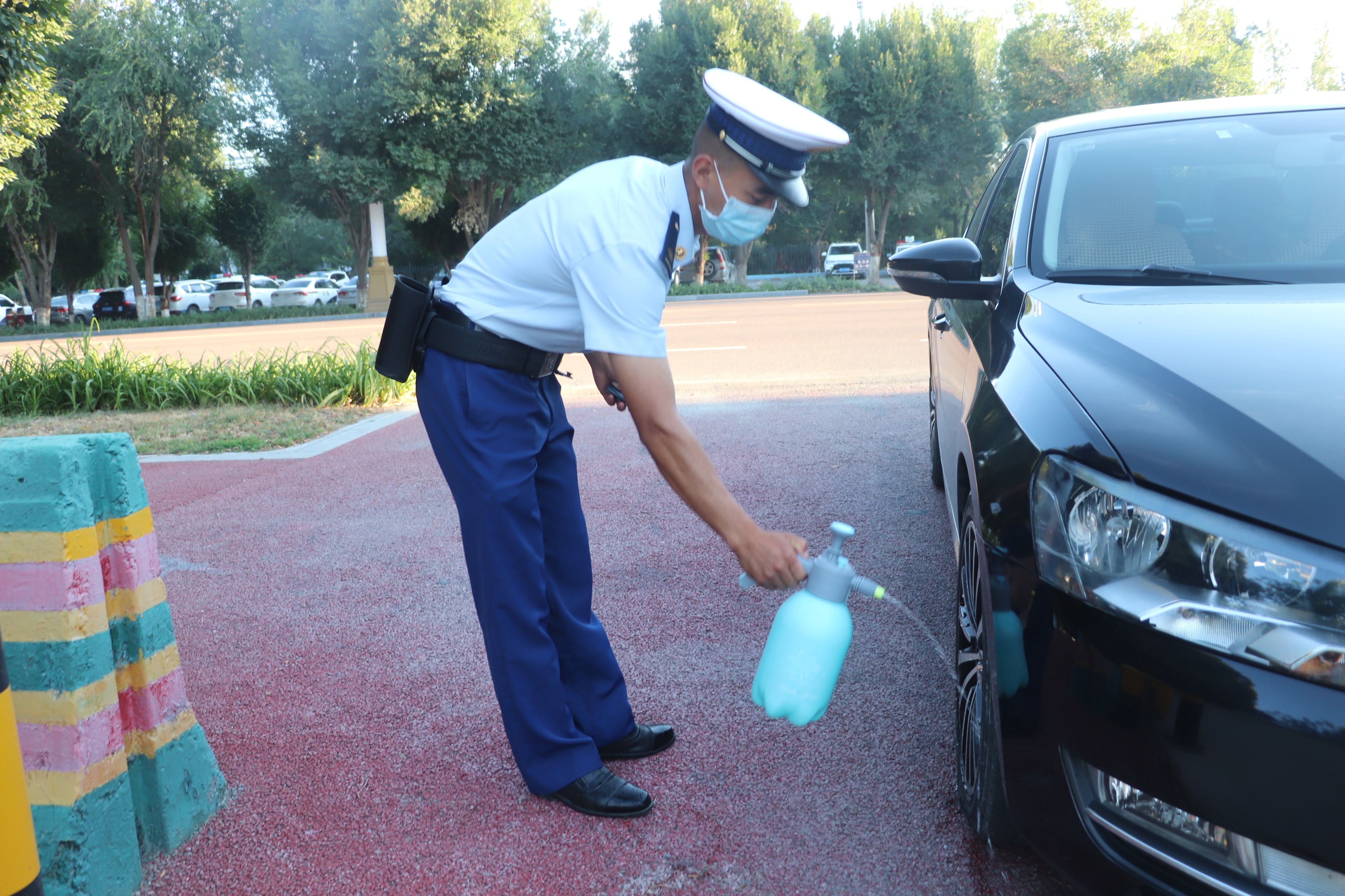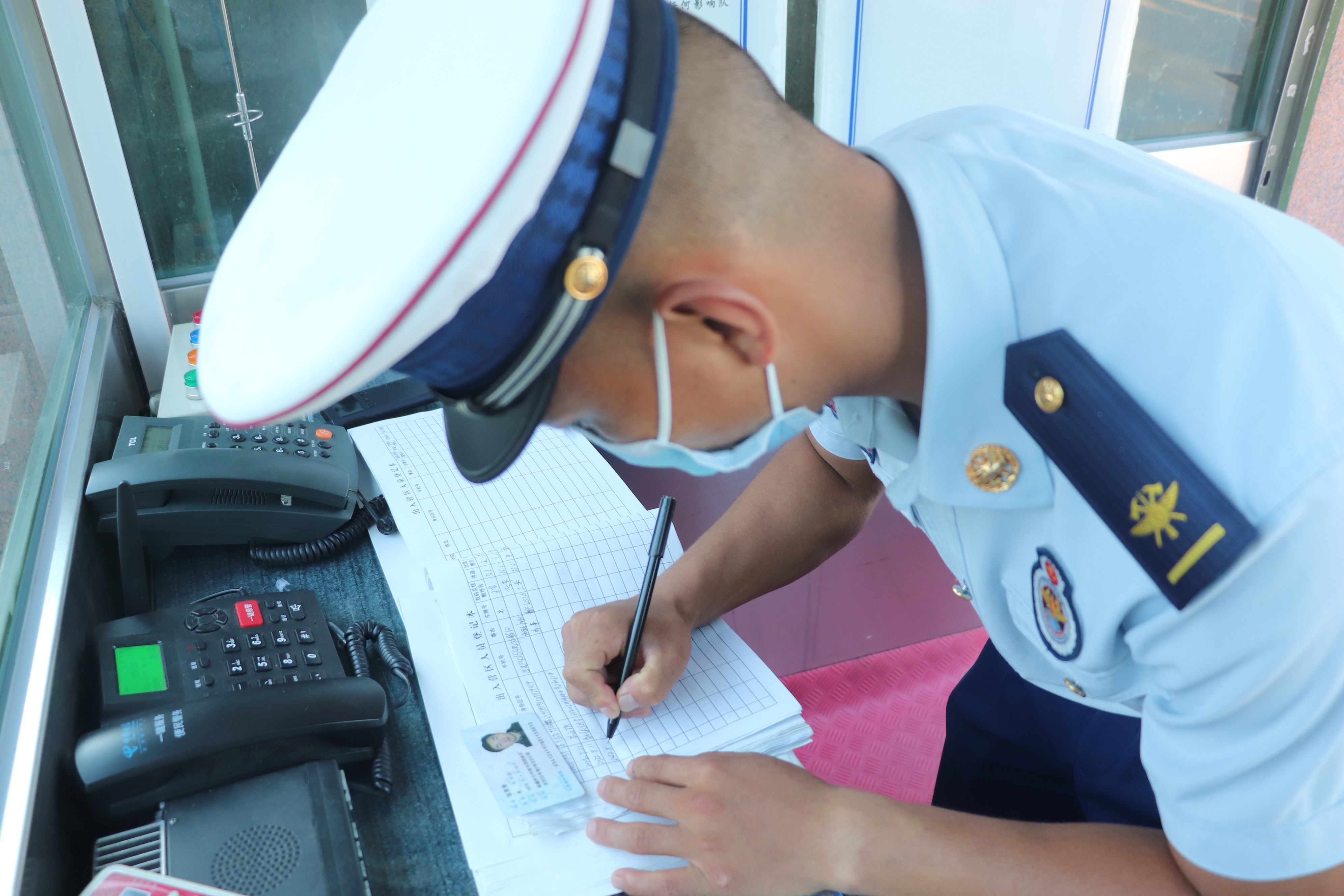 “同志,请出示您的证件及健康码、行程码,配合消杀工作”营门警卫人员严格落实出入营门人员车辆登记、体温监测、查看防疫“两码”、营区消毒等疫情防控措施,密切观察队员健康情况,摸排全体队员及家属行程轨迹,要求大队人员无特殊情况不得外出,尽可能减少与外来人员接触。