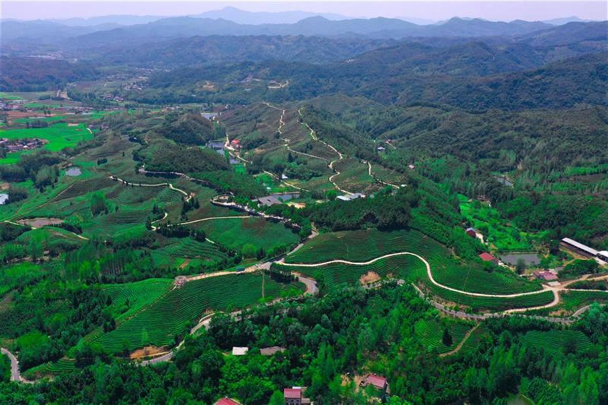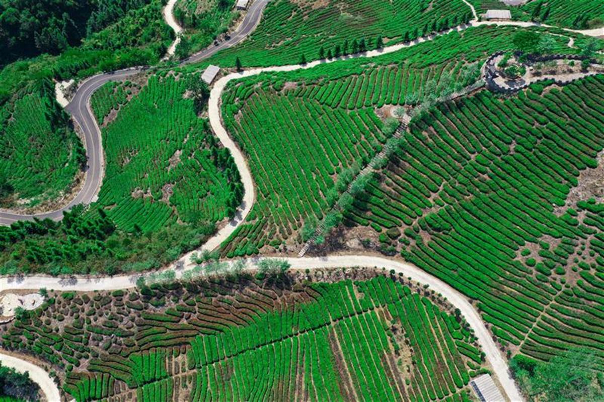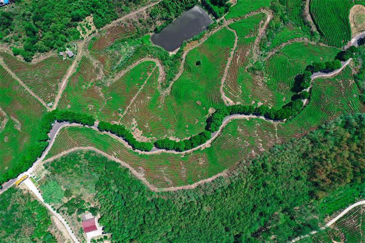 8月15日,谷城县五山镇,从百米高空俯瞰,何湾至老湾公路在青山绿水、田野民居间蜿蜒。