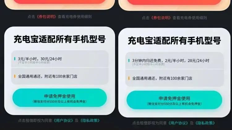 其中,美团充电宝计费规则为3至4.5元/小时,大多数柜机的起步时间按小时计,前1到2分钟内归还免费,不足1小时的按1小时计费。和其去年9月每半小时1.5至2元的计费规则相比,价格小幅上涨。