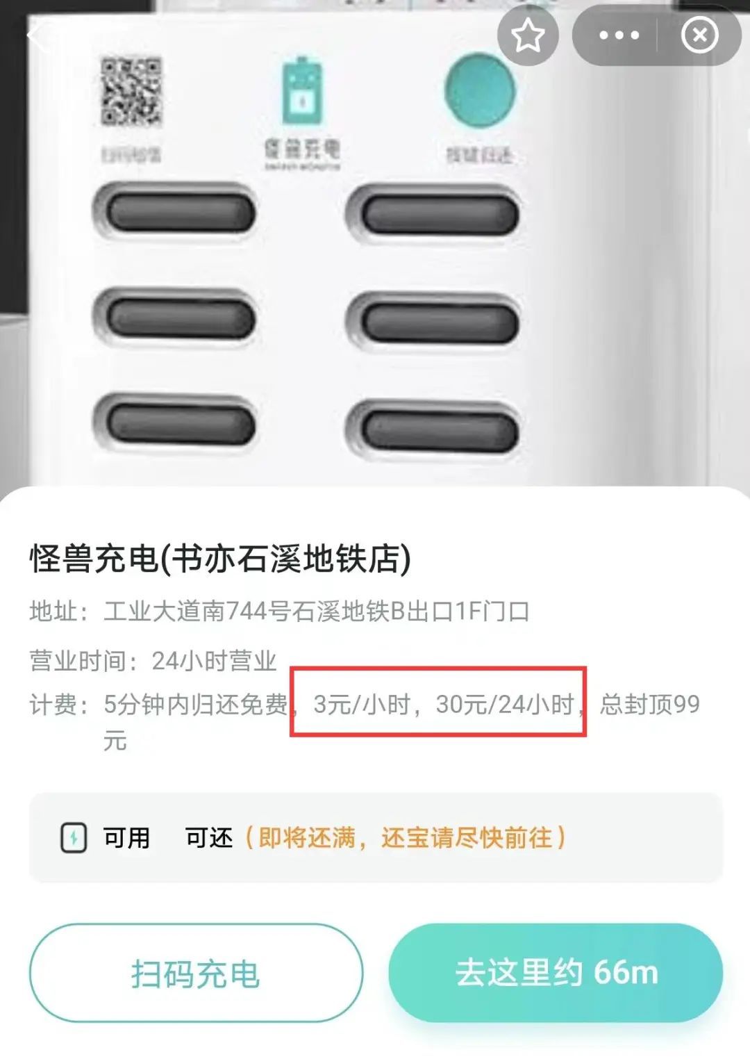 而以广州海珠区某奶茶店怪兽充电宝为例,怪兽充电宝每小时3元,24小时封顶30元,总封顶99元。