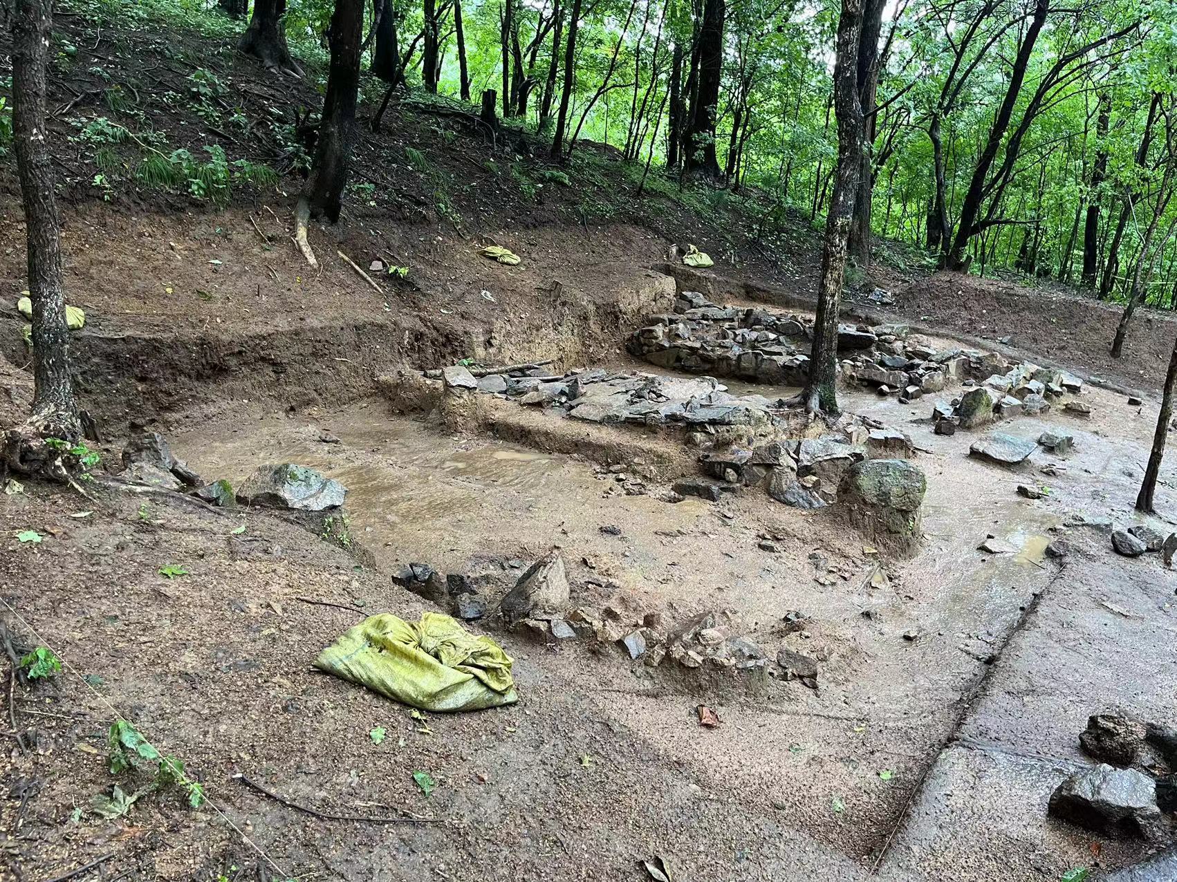 最先出现在记者眼前的是一处地窖遗址,石块上烟熏留下的黑色痕迹清晰可见。“这里是地窖子,前面是一处房址,我们在这一块发现了锄、铧、碗、罐等农业生产和生活用具,还发现了子弹和弹夹。”孟庆旭介绍。