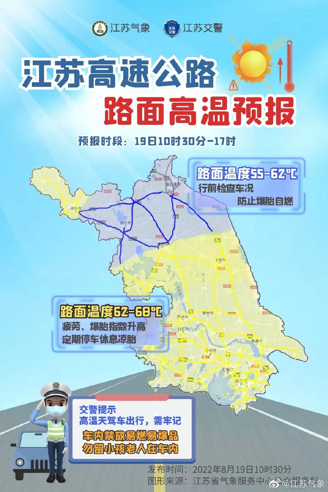“江苏气象”微博消息,江苏气象、交警联合发布全国首个省级路面高温预报,高温天地表温度过高时,轮胎的橡胶强度和帘线强力会降低很多,面临爆胎危险。预计今天(2022年8月19日)图上蓝色路段地表温度将达到55—62℃。黄色路段地表温度将达到62-68℃。