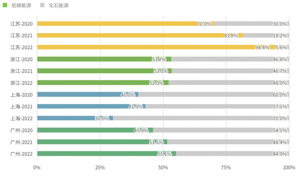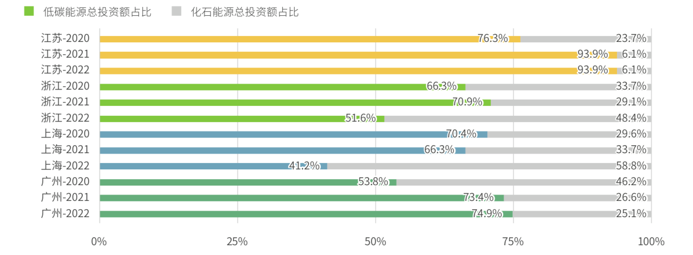 其中,低碳发展基础较弱的江苏“后起直追”,表现最为亮眼,在低碳能源方向投入的项目数量和金额稳定在70.0%以上,2022年其项目数量占比几乎是第二名广东的两倍。广东对低碳能源项目的投资稳步增长,低碳能源项目数量占比从2020年的45.9%上升至2022年的55.1%,总投资额由53.8%上升至74.9%,使其在2022年的低碳能源投入表现中位列第二。