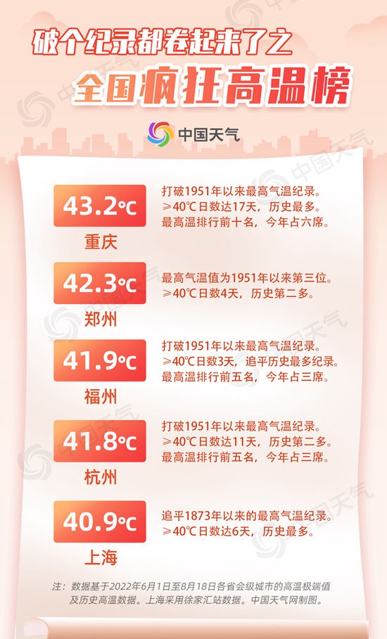 眼下,我国正在经历1961年以来的最强高温过程,重庆北碚破纪录成日常最高冲到45℃,杭州连续一个月高温没退,上海闷热桑拿50天……网友吐槽“嘉陵江晒成了嘉陵工”“江浙沪实现夏季集中供暖”“包邮区热成保熟区”。中国天气网特别盘点了省会级大城市的高温数据,推出全国高温耐力榜、夜间火炉榜等四大榜单,看看今年夏天哪里最难熬。