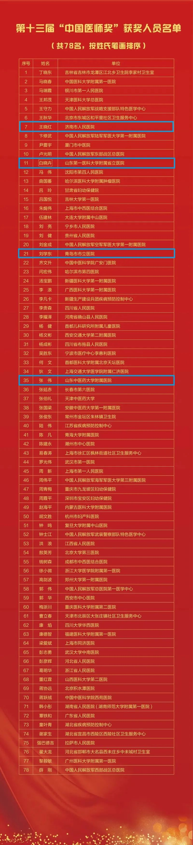 8月19日,2022年中国医师节庆祝大会暨第十三届“中国医师奖”颁奖大会在京召开,张伯礼等78名医师获“中国医师奖”。其中,山东省的济南市人民医院王晓红、山东第一医科大学附属省立医院白晓卉(已故)、青岛市立医院刘学东、山东中医药大学附属医院张伟等4人获奖。