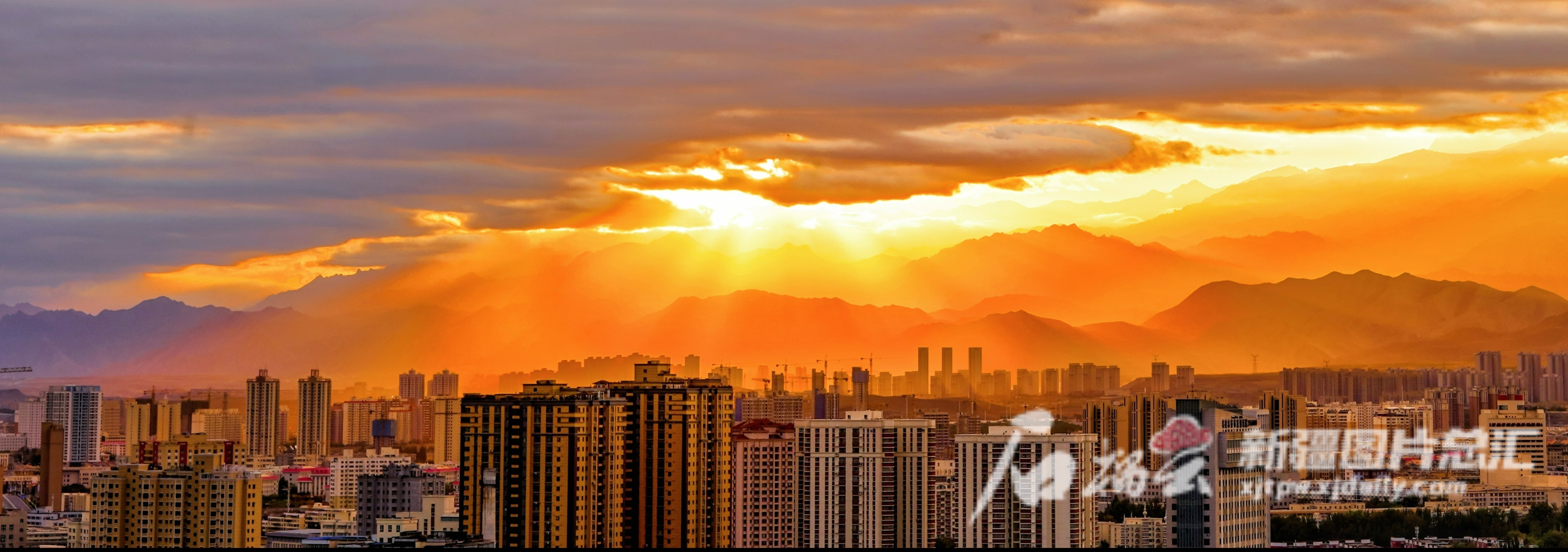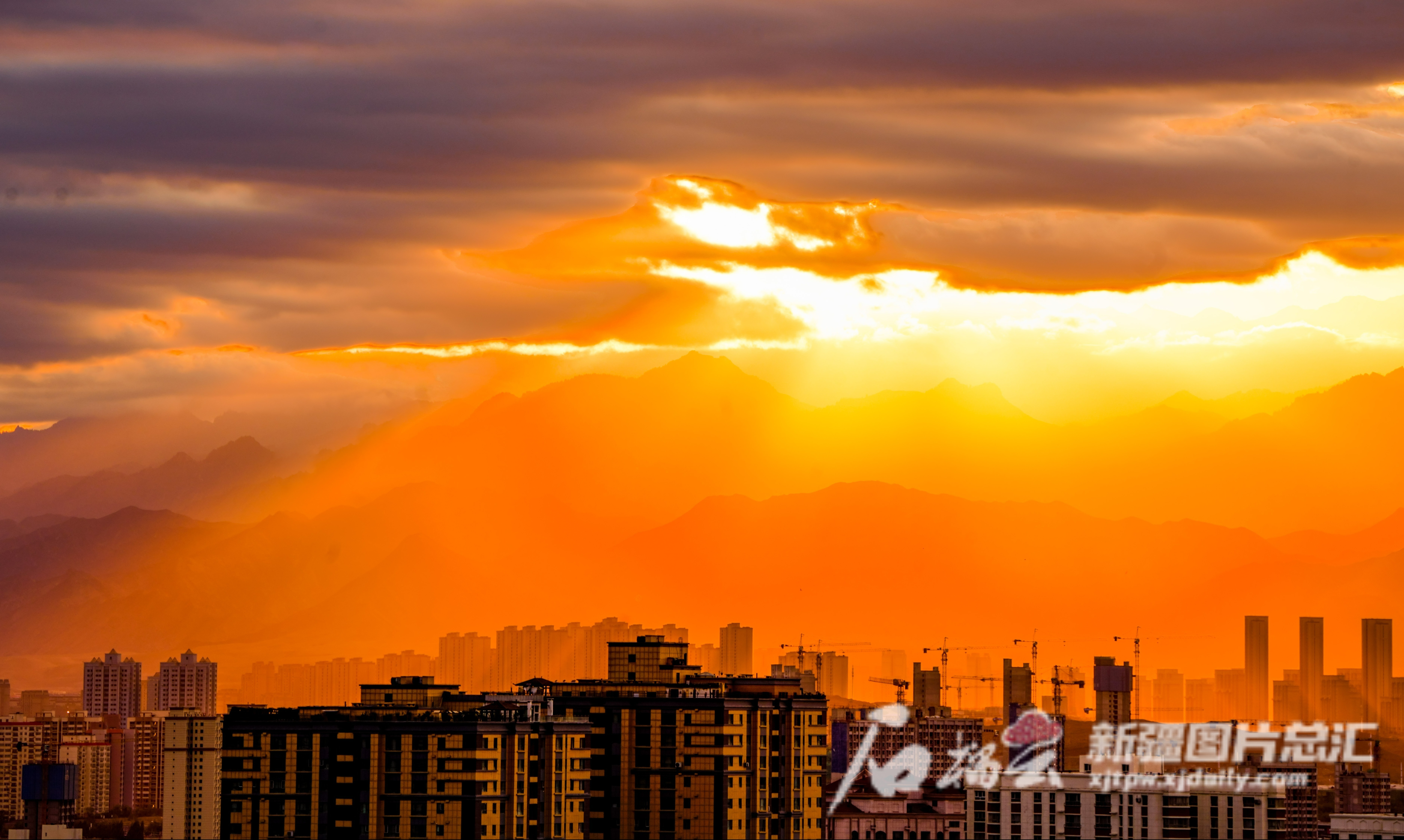 8月20日清晨,乌鲁木齐天气多云,初升的太阳从云层中洒出金光照亮城市。石榴云/新疆日报记者 杨伟 摄