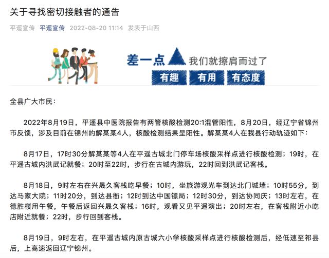 2022年8月19日,平遥县中医院报告有两管核酸检测20:1混管阳性,8月20日,经辽宁省锦州市反馈,涉及目前在锦州的解某某4人,核酸检测结果呈阳性。解某某4人在我县行动轨迹如下: