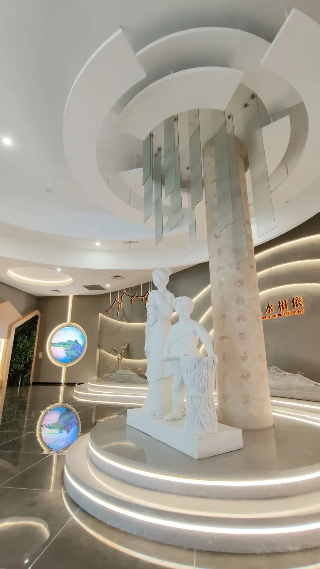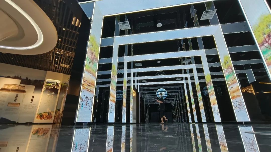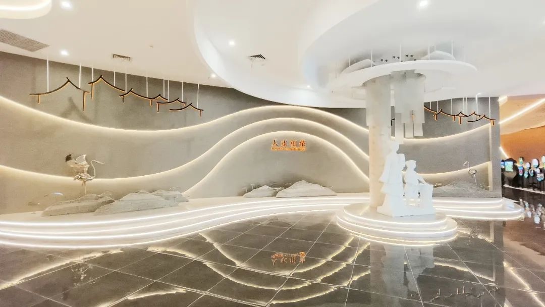 人水相依展厅中,从历史底蕴出发,讲述了娘子传说、梁子一百秒、十二时辰、越人歌等多个历史经典故事,大型的时光长廊,360度的环形屏幕,让观者每一步都有穿梭之感。