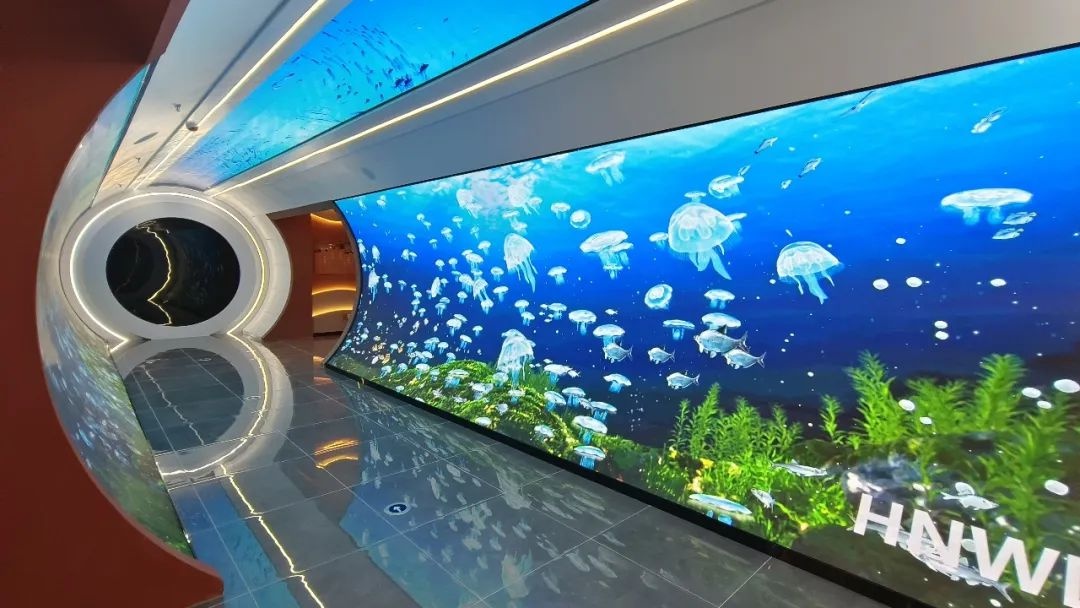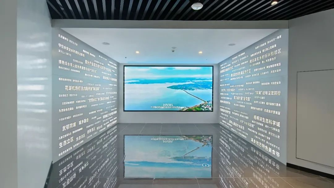 序厅内,沉浸式的梁子湖四季美景环绕于大屏幕之上,生动有趣的视觉效果,成为镜头里最出彩的背景。
