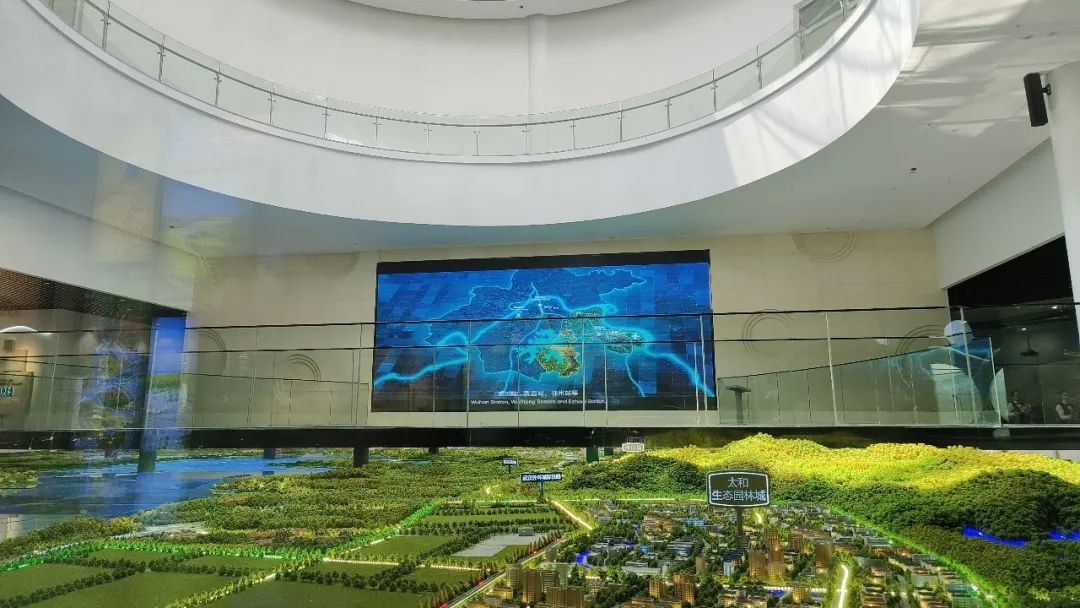 微缩的梁子湖区模型,标注出梁子湖区重点项目、生态价值工程、美丽村湾等内容,未来集文化、科技、旅游等多位一体的城市已现雏形。
