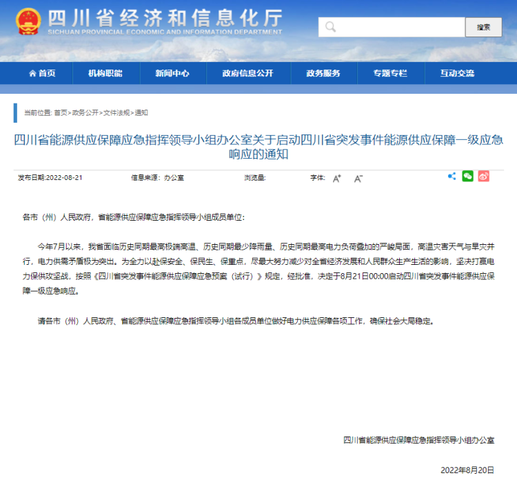 据通知,今年7月以来,四川省面临历史同期最高极端气温、历史同期最少降雨量、历史同期最高电力负荷叠加的严峻局面,高温灾害与旱灾并行,电力供需矛盾极为突出。为全力以赴保安全、保民生、保重点,尽最大努力减少对全省经济发展和人民群众生产生活的影响,坚决打赢电力保供攻坚战,按照《四川省突发事件能源供应保障应急预案(试行)》规定,经批准,决定于8月21日00:00启动四川省突发事件能源供应保障一级应急响应。