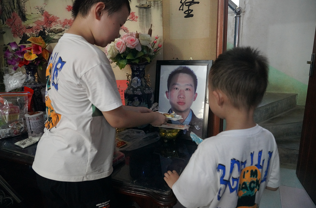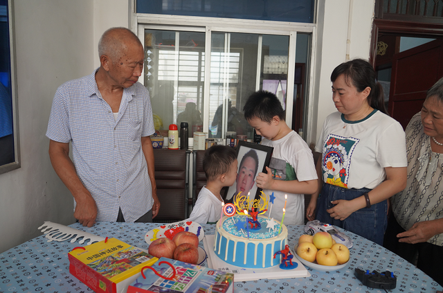 懂事的大儿子强忍悲痛从里屋捧出父亲的遗像,懵懵懂懂的小儿子把蛋糕切开,依次端给爷爷、奶奶、妈妈、哥哥和客人,用稚嫩的声音说道:“爸爸,我们长这么大,终于能和你一起过生日了,请你收下我给你叠的小星星和领带吧。”接着端起一块蛋糕递到爸爸的遗像前,说:“爸爸,吃蛋糕,我长大了也要像您一样,当一名警察,保护大家。”说完抱着爸爸的遗像亲了又亲。现场的人不禁潸然泪下,无不动容。