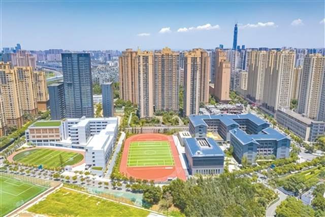 崭新的红色跑道上,白色标线已经划好。跑道中间是绿色的标准足球场,深绿与浅绿相间的场地看上去非常养眼——这就是位于锦江区成龙街道华新村的成都市七中育才学校华兴分校。“学校总占地面积24126平方米,建筑面积为32641.15平方米,建有教室48间,设有教学综合楼6层、风雨操场、会议室、图书室、餐厅、报告厅等活动区域。项目建成后将引进七中育才优质教学资源引领办学,预计今年秋季投入使用。”成都城投集团相关负责人介绍道。