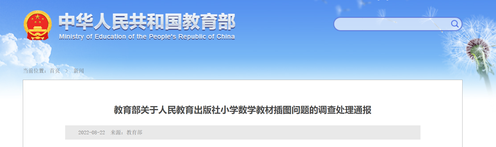 8月22日,教育部官网发布关于人民教育出版社小学数学教材插图问题的调查处理通报。