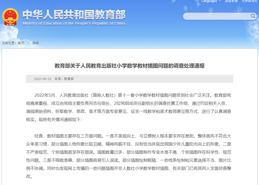 2022年5月,人民教育出版社(简称人教社)第十一套小学数学教材插图问题受到社会广泛关注。教育部党组高度重视,成立由党组主要负责同志任组长、2位党组成员任副组长的调查处置工作组,通过约谈相关人员,调阅原始资料,听取数学、思政、美术等方面专家意见,征求一线数学和美术教师意见等方式,进行了认真调查核实。现将有关情况通报如下: