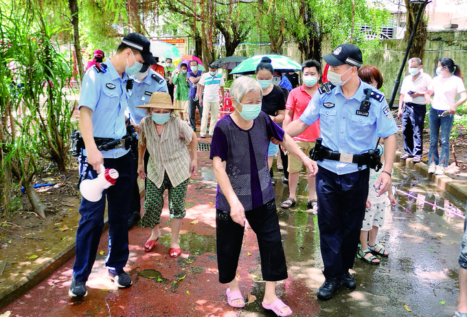 近日,临高县公安局临城西门派出所民警帮助老人做核酸检测。王晴 摄