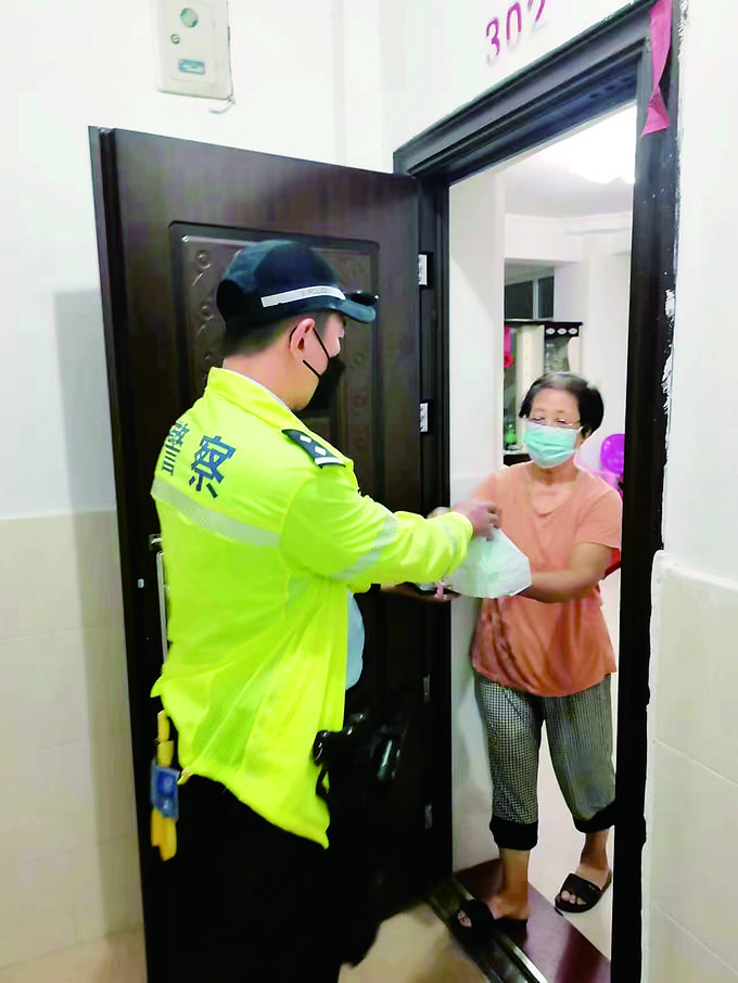 近日,临高县公安局临城东门派出所民警为群众送上药品。王海玥 摄