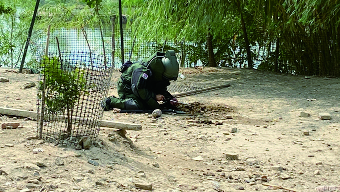 8月16日8时许,芜湖市公安局特警支队一大队排爆组李国伟、茅稳、简肖携带专业装备迅速赶往现场处置。经现场初步勘查,该手榴弹外观完好,弹体嵌入泥土。排爆组专业研判后,确定为日式97式手榴弹,机针保险栓处于已拉起状态,如处理不当随时有爆炸的可能性。排爆组立即制定排爆预案,在疏散周边群众后,排爆手进入核心区域迅速展开排爆工作。