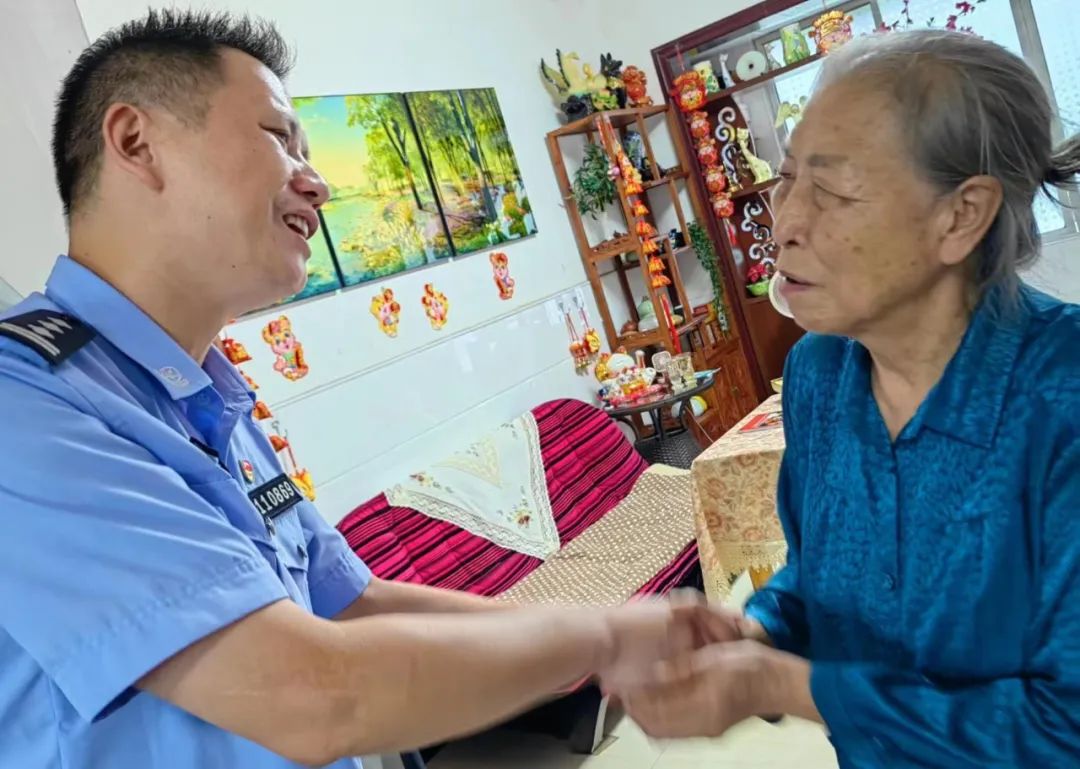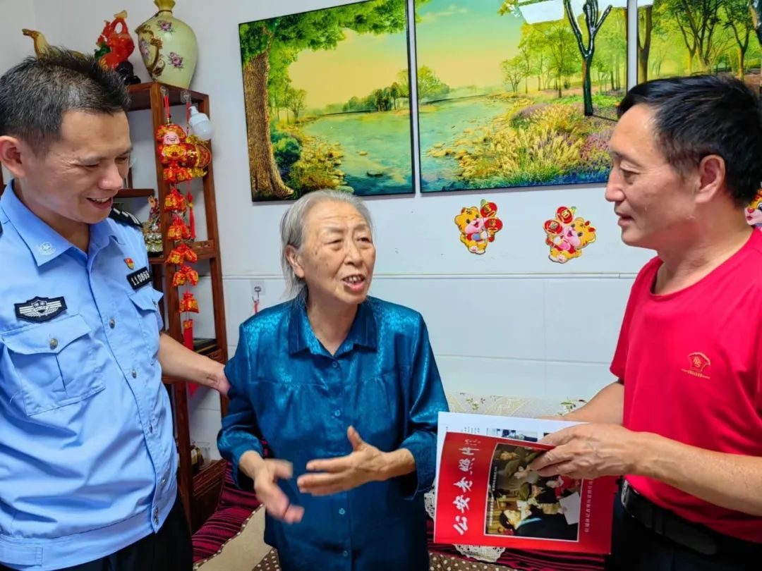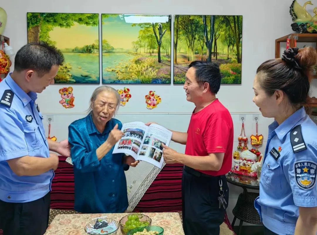 走进王恩琴的家,胡立强首先没有暴露自己的身份,而是让派出所的同志先与王恩琴交流。见到“娘家”派出所的民警们来看她这位退休多年的老民警,王恩琴激动不已。她一方面感谢在岗战友们对退休民警的关心,同时又鼓励年轻民警们忠于职守、服务人民!