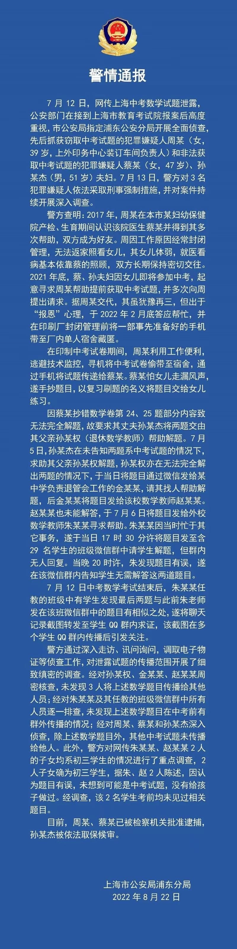 8月22日,上海市公安局浦东分局发布警情通报称,已对窃取中考试题的犯罪嫌疑人周某和非法获取中考试题的犯罪嫌疑人蔡某、孙某杰夫妇依法采取刑事强制措施。具体通报如下: