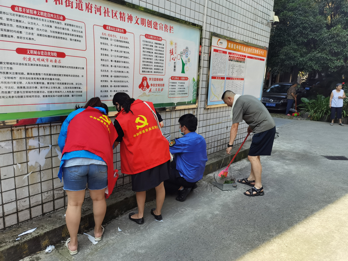 8月20日,成都市高新区中和街道党工委、办事处班子成员深入社区联系点,下沉小区、院落,组织参与“全民大扫除”环境整治活动,与社区工作者、志愿者、“双报到”在职党员互助互补,针对小区、院落内堆积杂物、沉积垃圾、杂草、破损公益广告等现象进行“地毯式”清理。