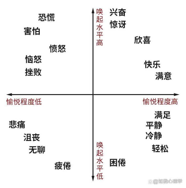 我们可以按照两个维度,来描述自己所拥有的一些基本情绪:一个是“唤起程度”(arousal),即这是一种让你“有感觉“还是“没感觉”的情绪,比如“愤怒”就是一种比“抑郁”唤起程度高的情绪;