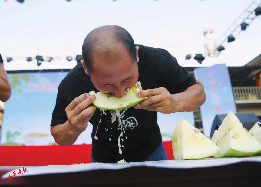 瓜王出炉后,吃瓜群众也进行了一番较量,吃得快、吃得干净者胜出。台上人吃得奋不顾身,台下人笑得前仰后合。喜悦会传染,场面很快进入了欢腾,庆祝丰收的演出也在夜色中登场,吸引着十里八乡的村民扶老携幼、呼朋引伴,欢腾喜悦地庆祝着丰收。