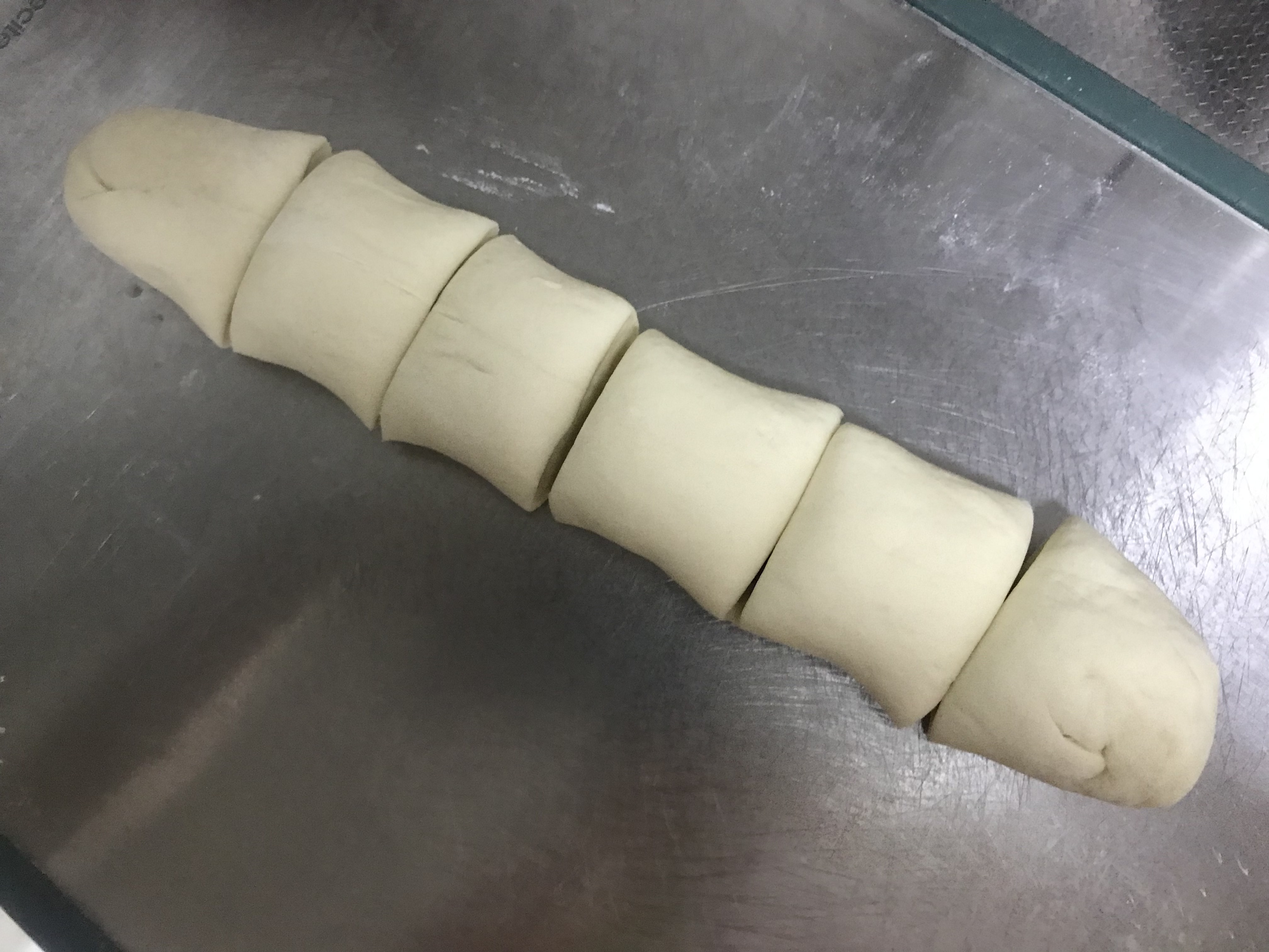3、将发酵好的面团取出,先揉均匀,将发酵时所产生的气体全部揉出去,然后将其搓居长条,再切分6份,如图所示。