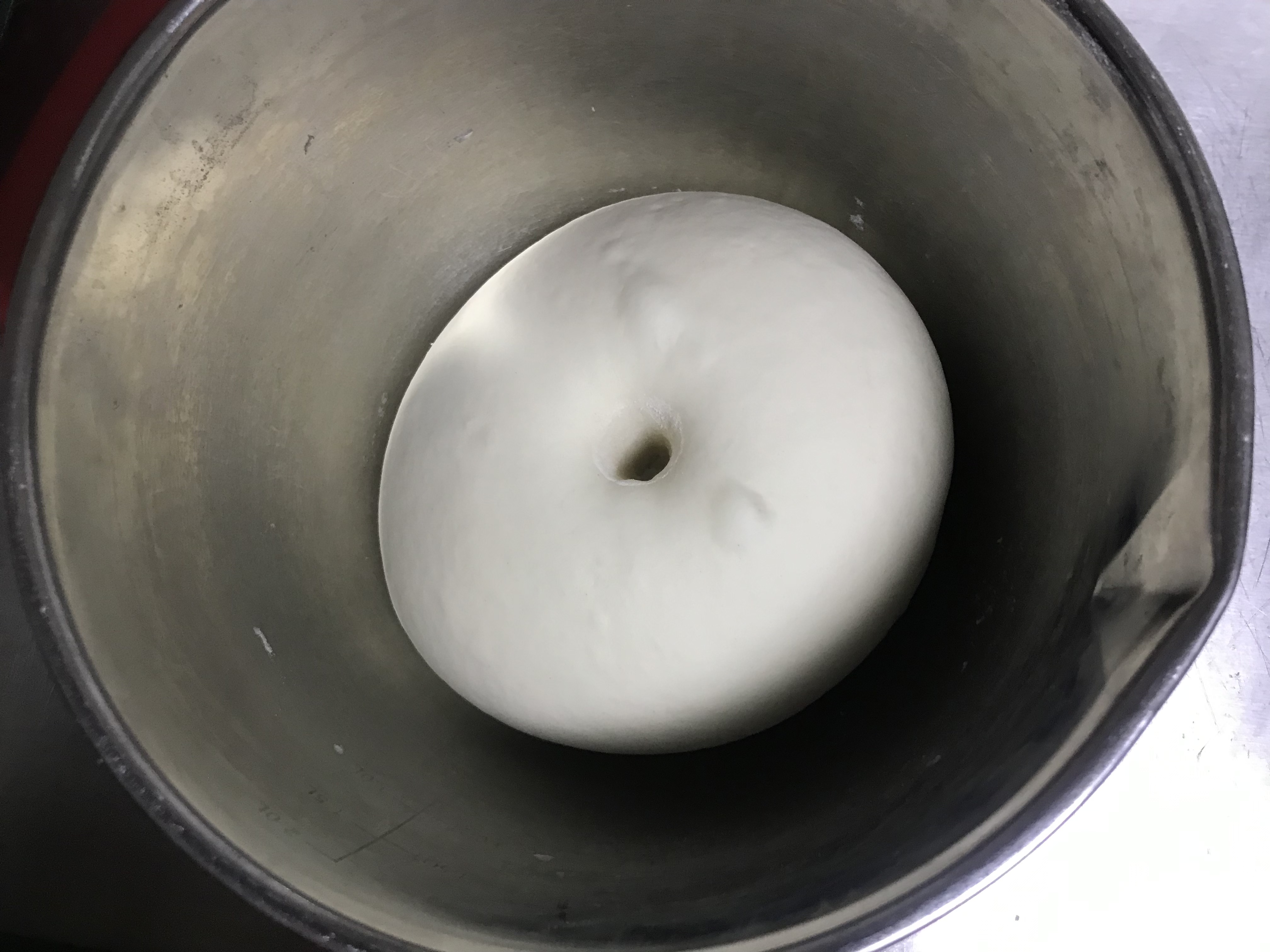 2、将揉好的面团,盖好保鲜膜开始进行发酵,将其发酵至约为原来面团的2倍大,用手指戳个洞,其洞口是不回缩而且也不塌陷的状态即可,说明发酵可以了,如图所示。