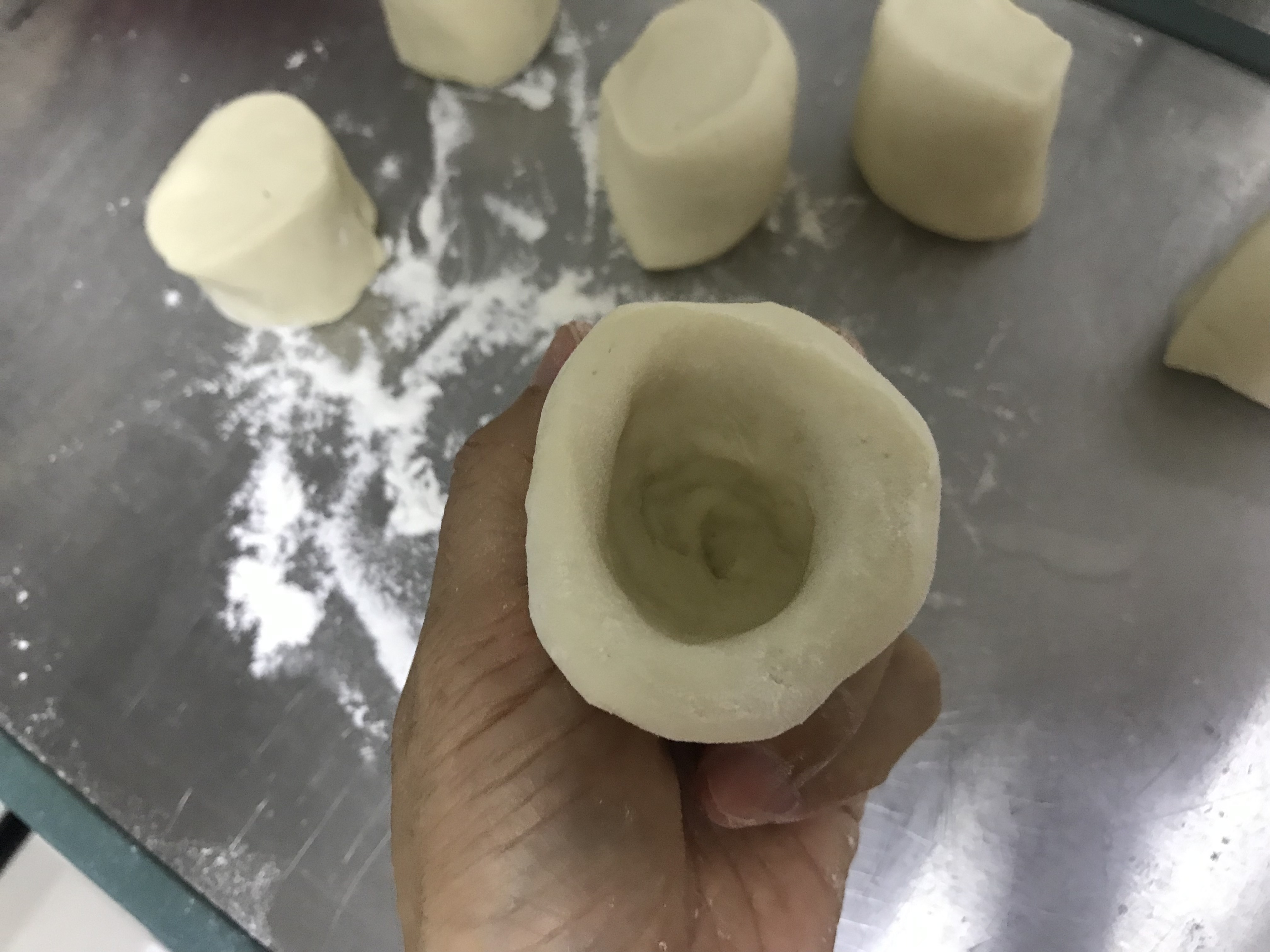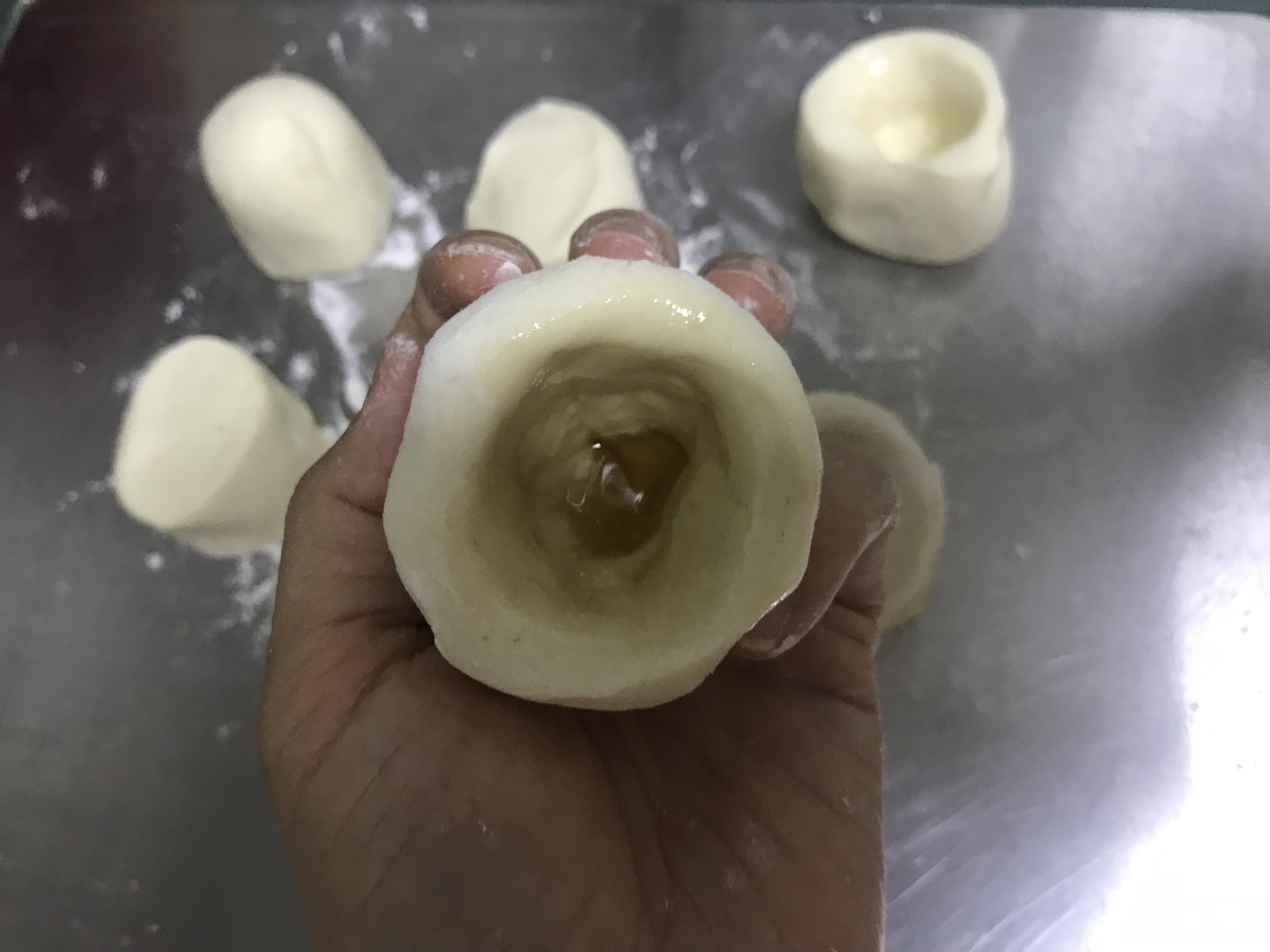 4、取一个切分好的面团,将其再次揉均匀,然后用大拇指按压住底部中心处,边捏边转,将其转出一个洞,然后在其面团洞口片,倒入适量香油(也可以玉米油等其它食用油),如图所示。