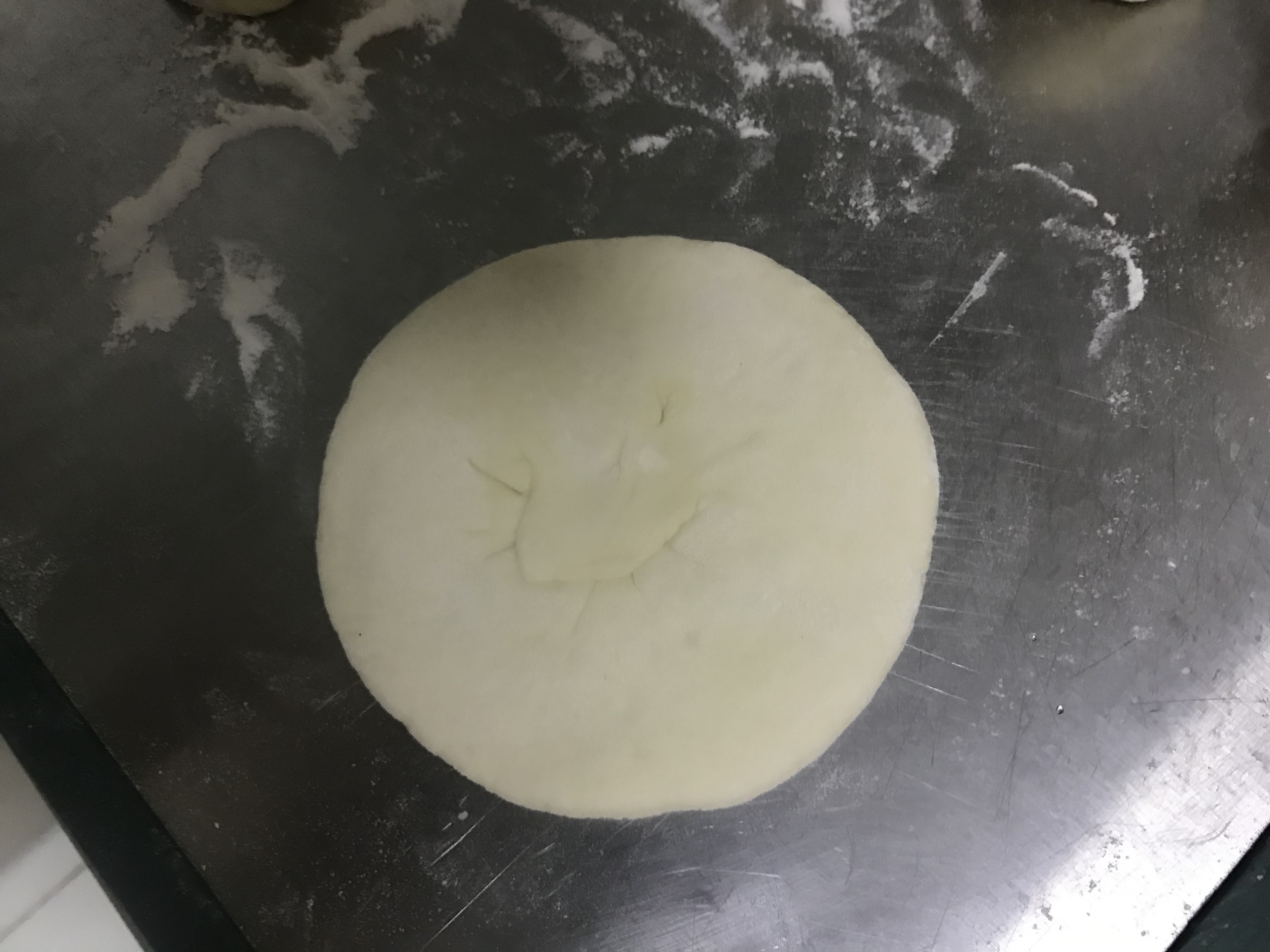 7、捏好后的面团,轻轻按压扁,用擀面杖将其轻轻擀成小圆包的状态,如图所示。