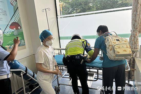 到达医院后,辅警张旭东让婴儿爸爸栾先生先去联系医生,他抱着婴儿一路跑到急救室,把婴儿放到救治床上,等待医生检查治疗。