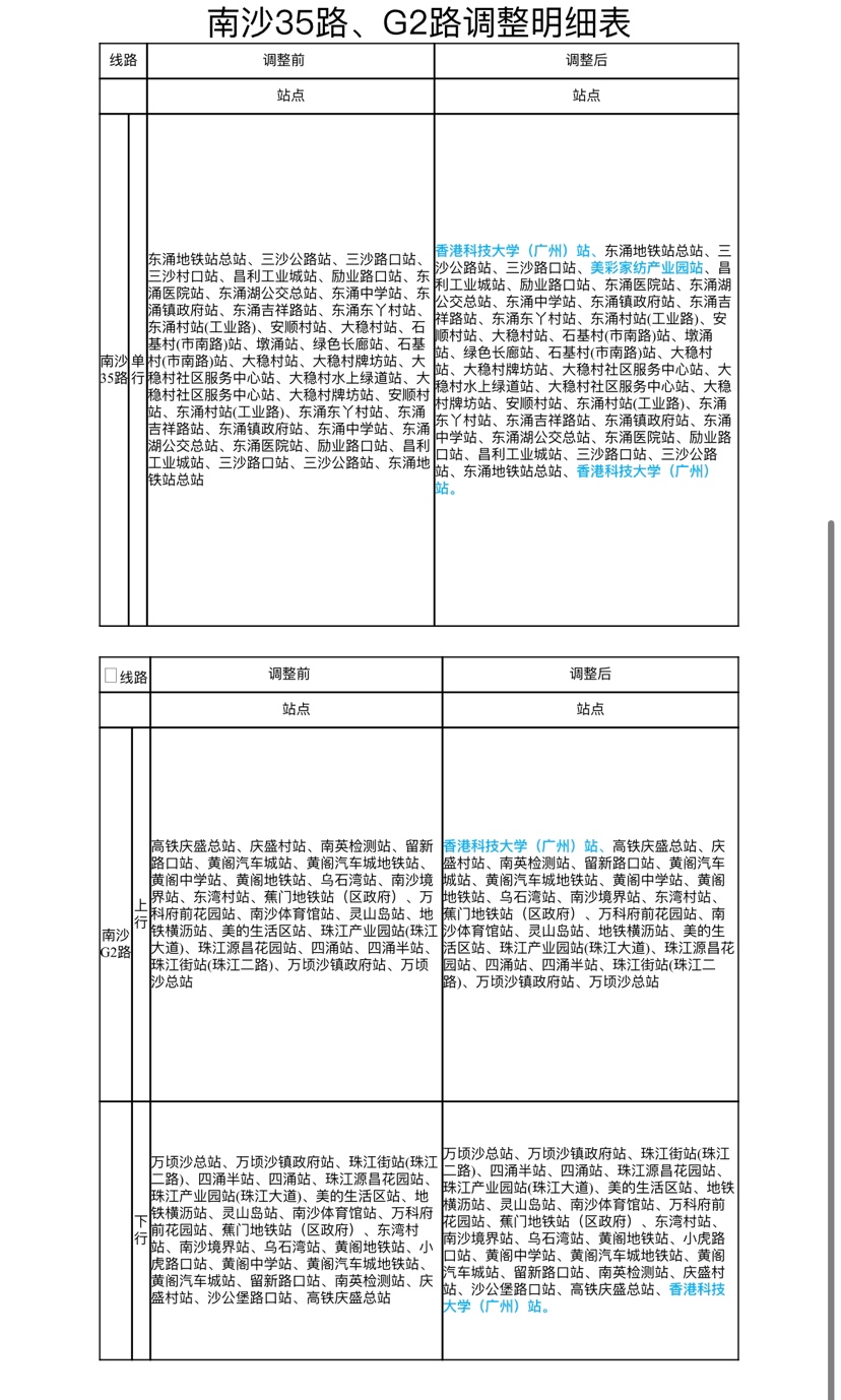 其中,南沙35路总站由东涌地铁站总站调整为香港科技大学(广州)站,从香港科技大学(广州)站上车,下一站就是东涌地铁站总站,可换乘4号地铁,师生前往广州大学城、广州中心城区都非常方便。南沙G2路总站由高铁庆盛总站调整为香港科技大学(广州)站,从香港科技大学(广州)站上车,下一站就是高铁庆盛总站,可换乘4号地铁和高铁,在地铁横沥站,还可换乘18号地铁,市民无论是要前往深圳,还是要前往广州中心城区,出行都非常便捷。