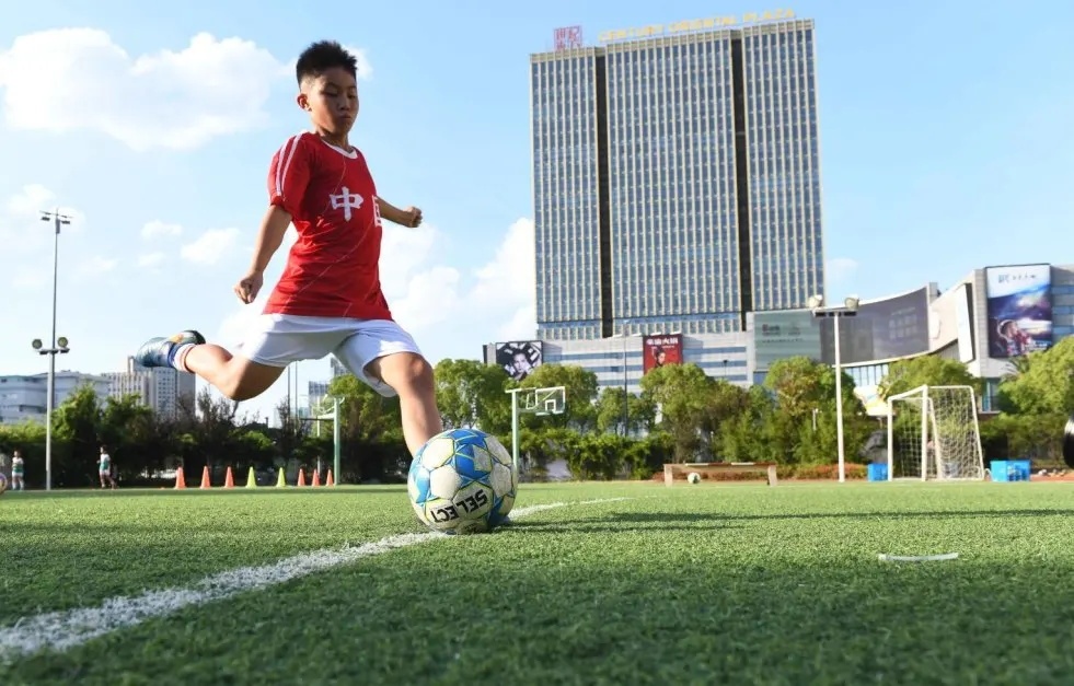 下午4时30分,烈日的余温还未散去,在鄞州江东中心小学华光校区的足球场上,20多位满头大汗的小球员,正在进行绕桩射门训练,孙臣曦就是其中一位。