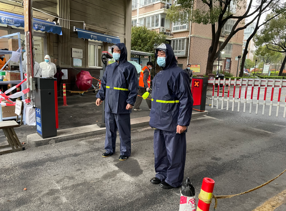 (右一)疫情期间郭泉云在小区门口执勤值守