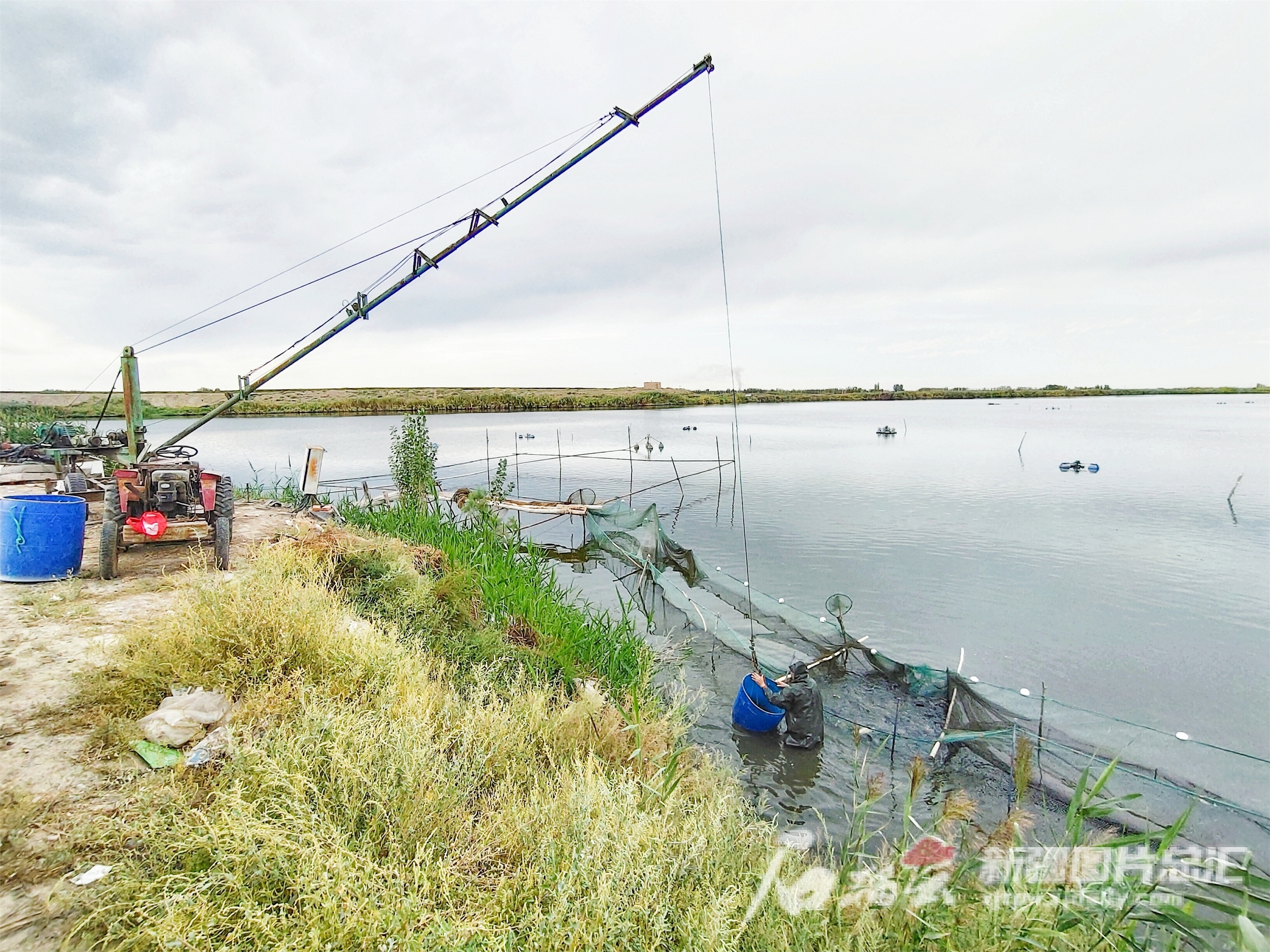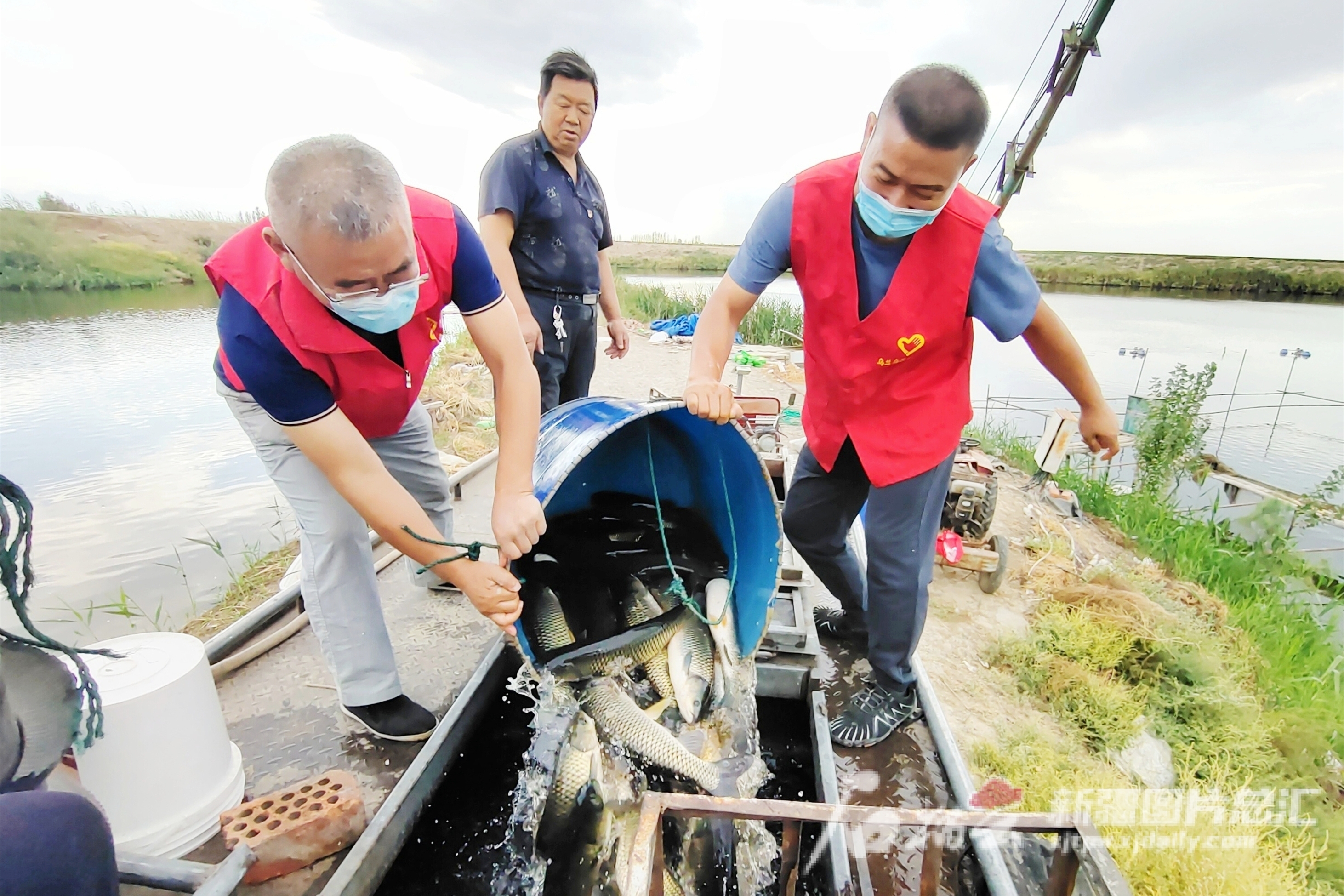 8月20日,沙湾市乌兰乌苏镇黄家梁新村北湖鱼塘养殖基地,养殖户正在捕捞鱼。兰玲 摄