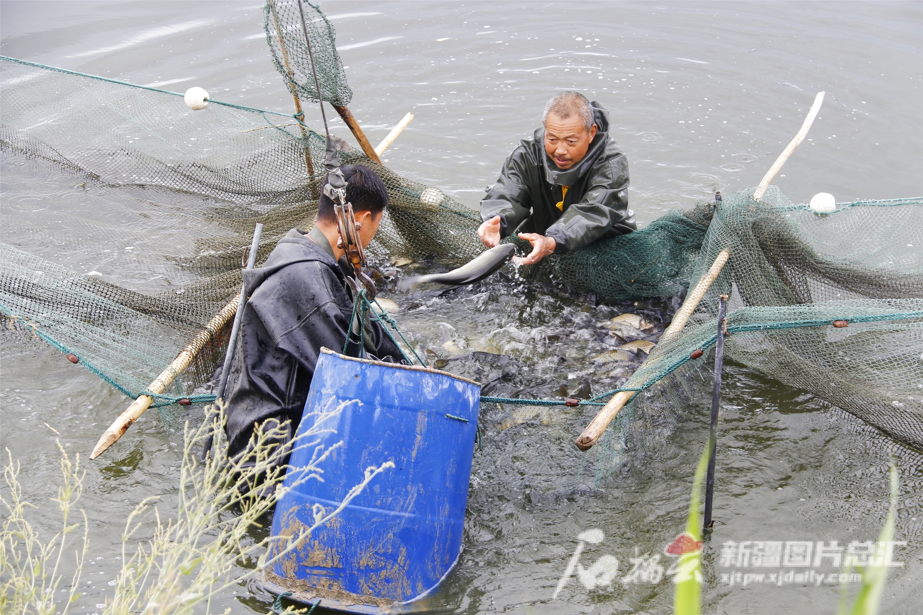 8月20日,在沙湾市乌兰乌苏镇黄家梁新村北湖鱼塘养殖基地,一尾尾鱼儿活蹦乱跳,呈现出一派“人欢鱼跃”的丰收景象。兰玲 摄